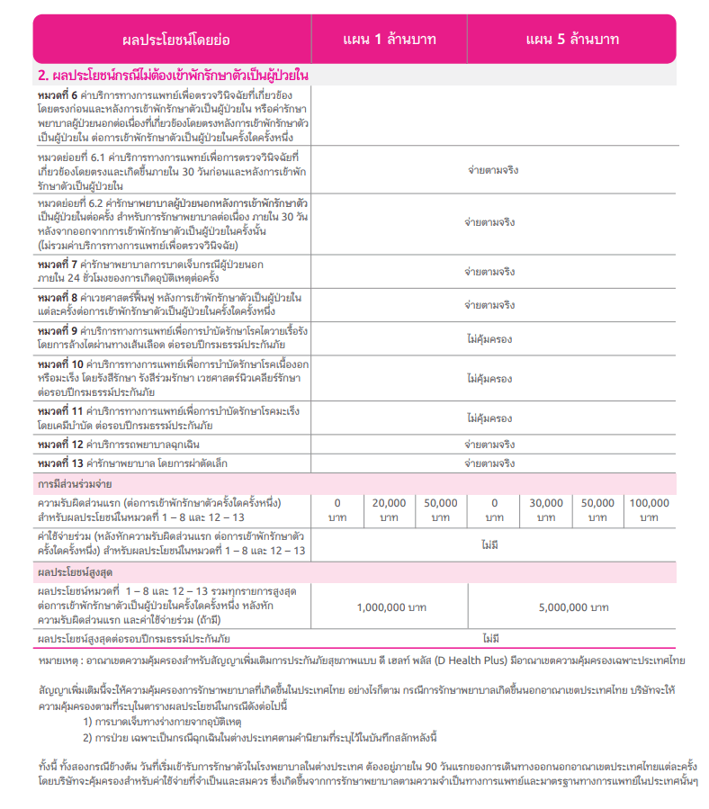 - ผู้ขอเอาประกันภัยสามารถซื้อสัญญาเพิ่มเติม ดีเฮลท์ หรือ ดีเฮลท์ พลัส ได้มากกว่า 1 สัญญา โดยผลประโยชน์สูงสุดต่อการเข้าพักรักษาตัวครั้งใดครั้งหนึ่ง รวมทุกสัญญา และ รวมทุกช่องทางแล้ว จะต้องไม่เกิน 5,000,000 บาท ต่อผู้ขอเอาประกันภัยแต่ละคน