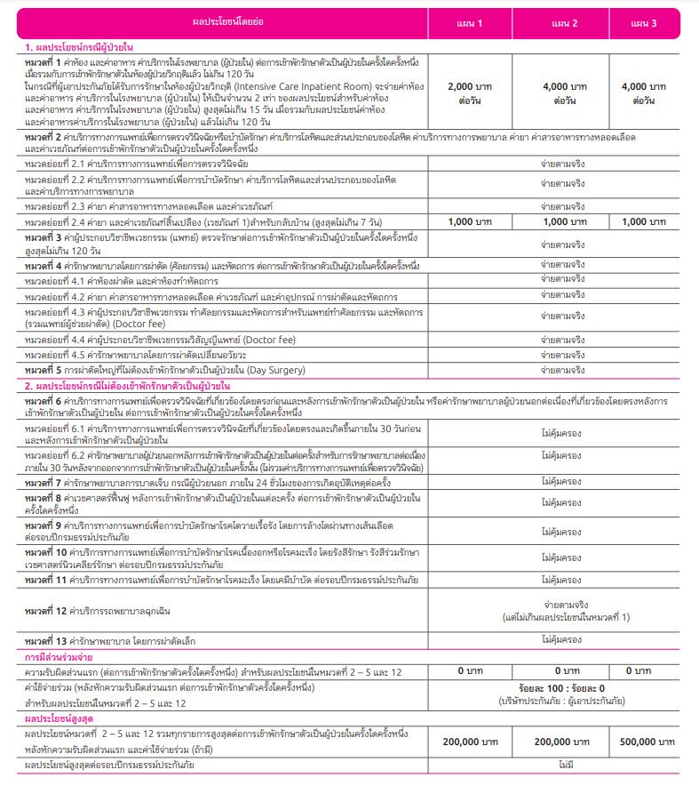 - เหมาจ่ายตั้งแต่บาทแรก สูงสุด 500,000 บาท ต่อการเข้าพักรักษาตัวครั้งใดครั้งหนึ่ง