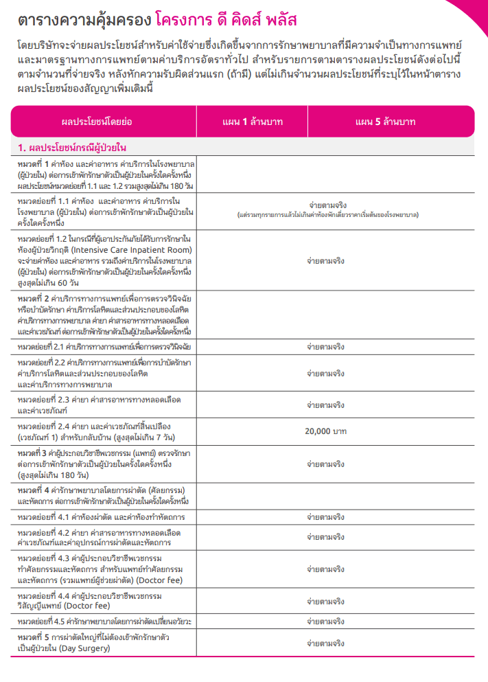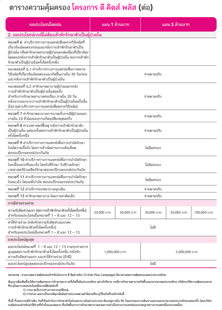 - ดี คิดส์ พลัส ช่วยจ่ายส่วนเกิน ค่าห้องเดี่ยวมาตรฐาน ค่าห้องผู้ป่วยหนัก (ไอ.ซี.ยู.) ทั้งค่าหมอ ค่ายา ค่าตรวจ ค่าผ่าตัด ค่ากายภาพบำบัด กรณีแอดมิทรวมถึงการรักษาฟื้นฟูต่อเนื่องกรณีผู้ป่วยนอก เหมาจ่ายในวงเงินเดียวสูงถึง 5 ล้านบาท* ต่อการเข้าพักรักษาตัวครั้งใดครั้งหนึ่ง