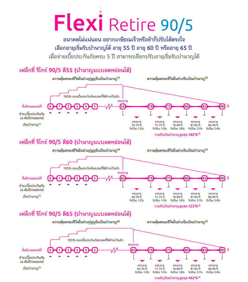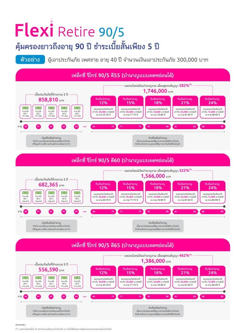 เฟล็กซี่ รีไทร์ 90/5 ดี 55, ดี 60, ดี 65 ชำระเบี้ยสั้นเพียง 5 ปี รับเงินยาวถึงอายุ 90 ปี ลดหย่อนภาษีได้สูงสุด 200,000 บาทต่อปี