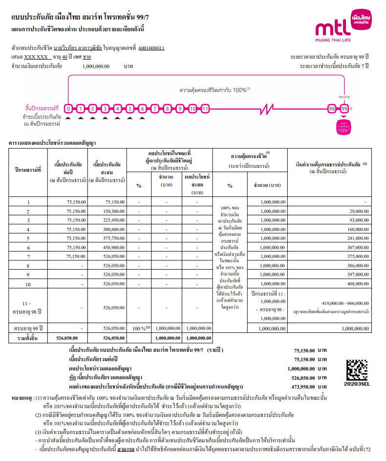 ตัวอย่าง ผู้ชายอายุ 40 ปี เบี้ยประกัน 75,150 บาทต่อปี ความคุ้มครองชีวิต 1,000,000 บาท