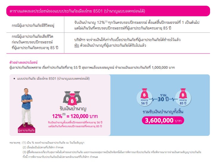 เมืองไทย 8501 (บำนาญลดหย่อนได้) ชำระเบี้ยประกันภัยเพียงแค่ครั้งเดียว รับเงินบำนาญสม่ำเสมอ 12 % ทุกปี หลังเกษียณ เลือกได้ว่าจะรับบำนาญสิ้นปีกรมธรรม์ที่ครบอายุ 85 ปี ลดหย่อนภาษีได้สูงสุด 200,000 บาทต่อปี